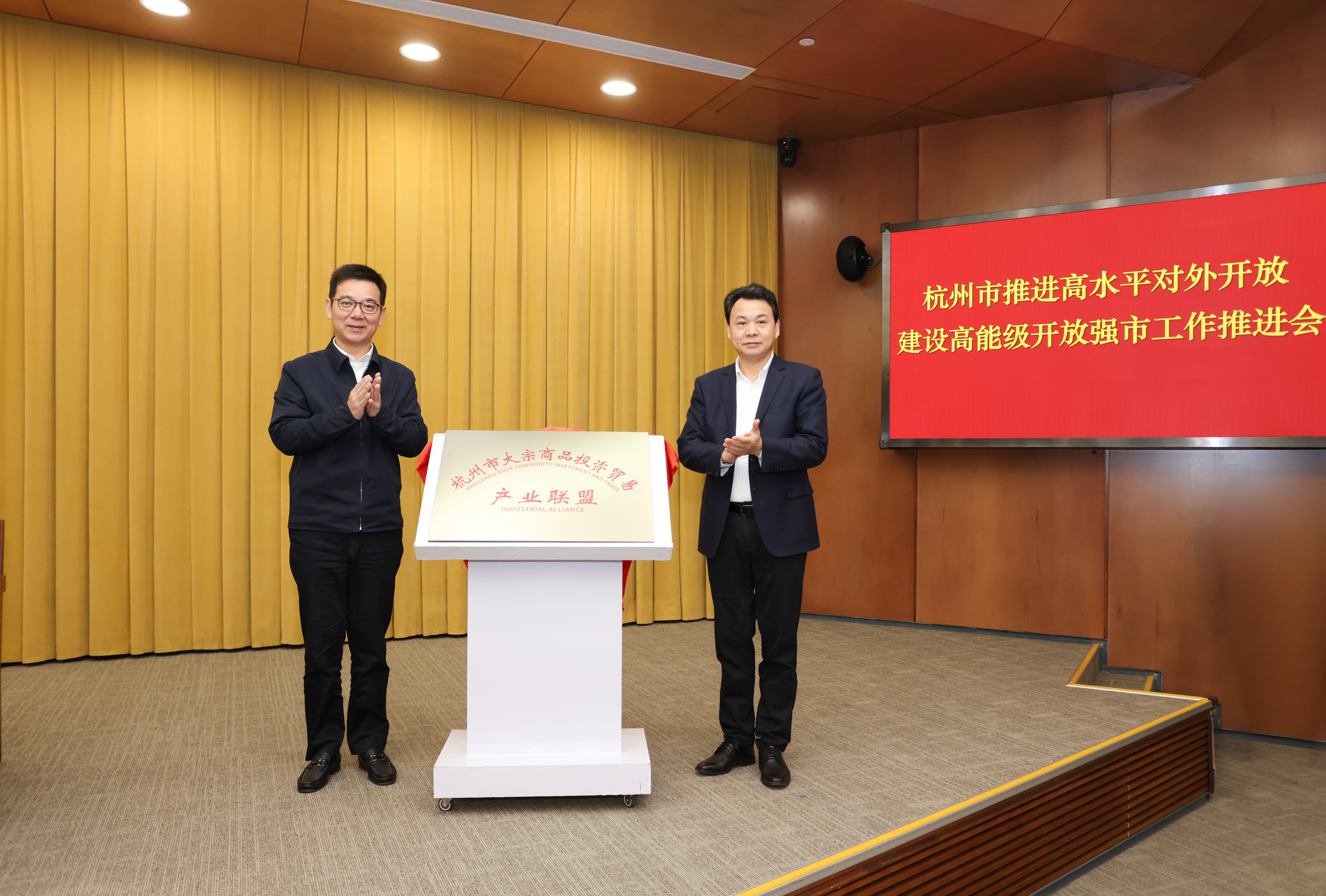 会议现场,杭州市大宗商品投资贸易产业联盟(以下简称“产业联盟”)正式揭牌,杭州市委常委、副市长章登峰,星空(中国)xingkong·官方网站集团党委书记、董事长钮健参与揭牌仪式。